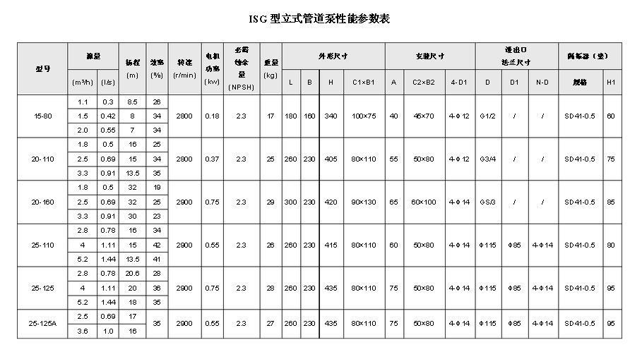 产品概述 采用IS型离心泵之性能参数,在一般立式泵的基础上进行巧妙组合设计而成。同时根据使用温度、介质等不同在管道泵基础上派生出适用热水、高温、腐蚀性化工泵、油泵。该系列产品具有高效节能、噪音低、性能可靠等优点。 ISG型号意义: 例如:ISG100-315(I)AB IHG-单级单吸化工管道离心泵 100-进出口口径(mm) 315-叶轮名义直径(mm) I - 扩流型 A、B-叶轮经第一、二次切割 ISG200-400管道泵性能参数